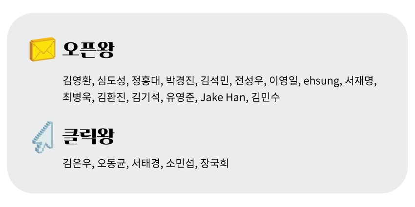 원래는 오픈왕 10분을 선정할 예정이었지만, 예상보다 훨씬 많은 분께서 꾸준히 뉴스레터를 읽어주셔서 선정에 고민이 많았는데요. 그래서 특별히 오픈왕 15분, 클릭왕 5분을 선정했습니다! |