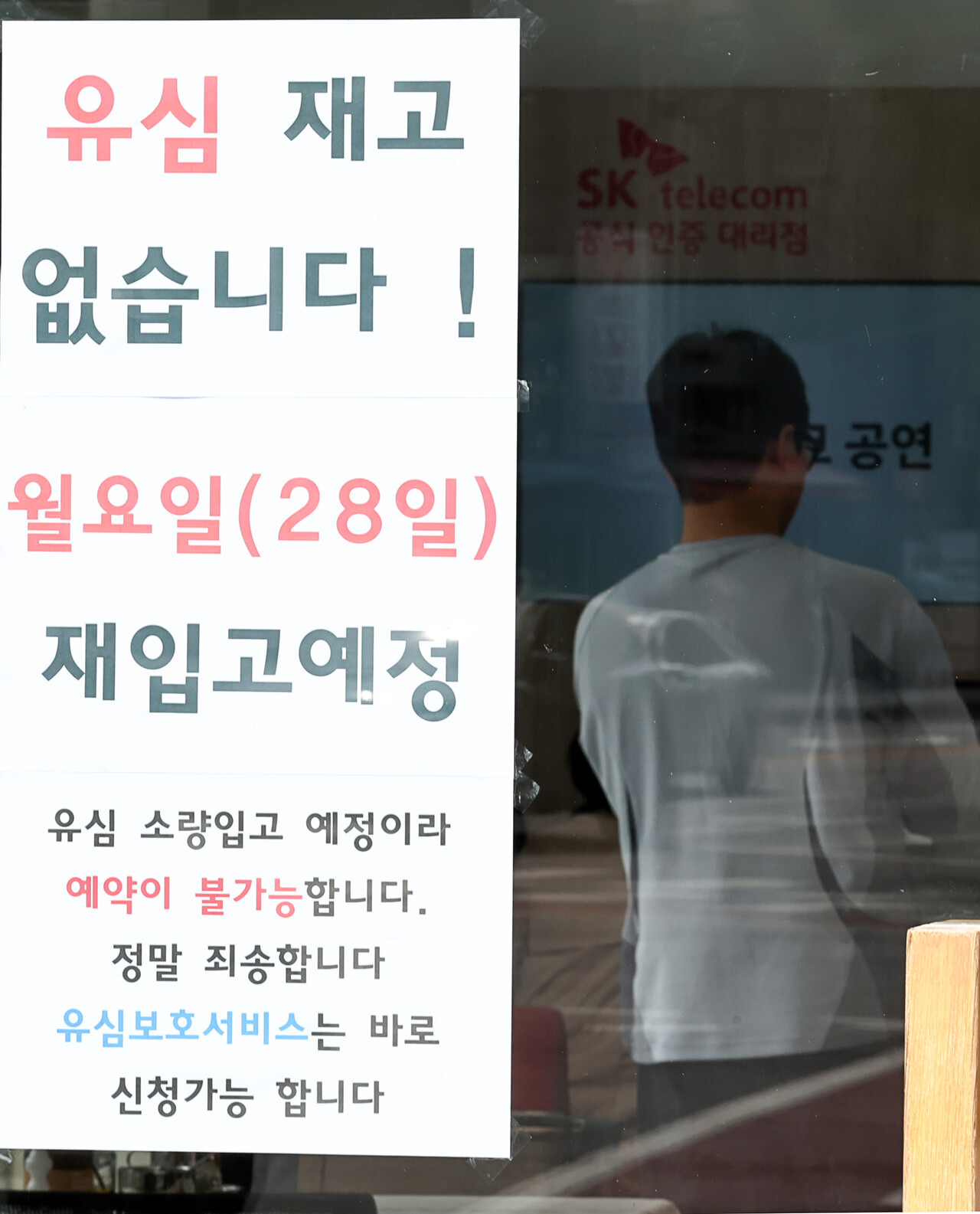 SK텔레콤 대리점 앞에 붙어있는 '유심재고' 관련 안내문 (이미지 출처 연합뉴스) |